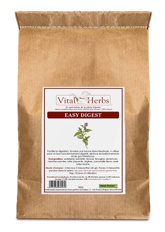 Favorise la digestion et l'assimilation des repas, stimule la sécrétion biliaire. Soutient le transit intestinal. Convient également en période de changement de nourriture ou en cas de crottins mous.